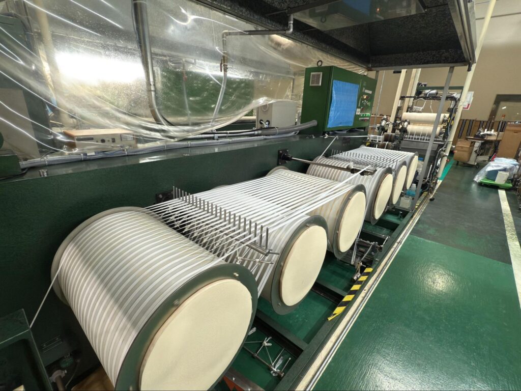 整経は経編機、織機の準備工程となり、経編、織機に必要な経糸を正確な本数・幅で均等に並べ、すべての糸の長さをそろえ、均一な張力を与えるために行います。これにより、糸切れや織りムラを防ぎ、織りの品質を安定させることができます。
