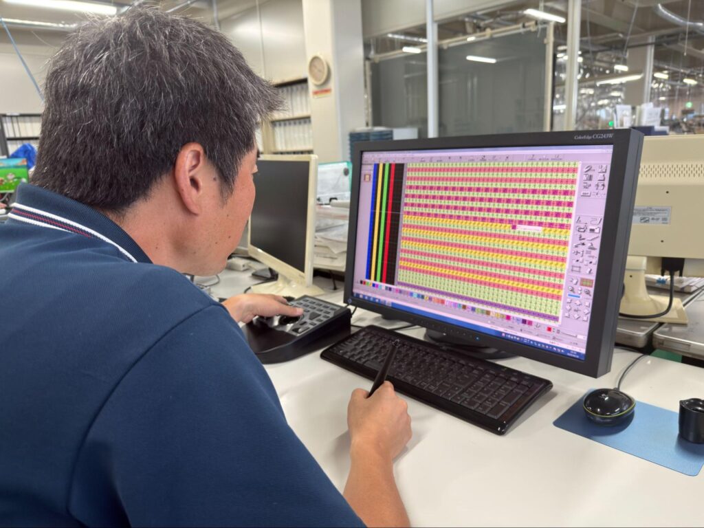 生地にキズ、汚れ、色ムラなどの不良がないかを確認し、寸法や品質が規格どおりであるかをチェックする工程です。検反機を用いて目視や測定を行い、製品として出荷できる品質かどうかを判断します。