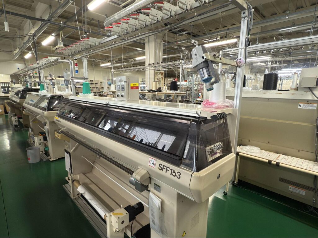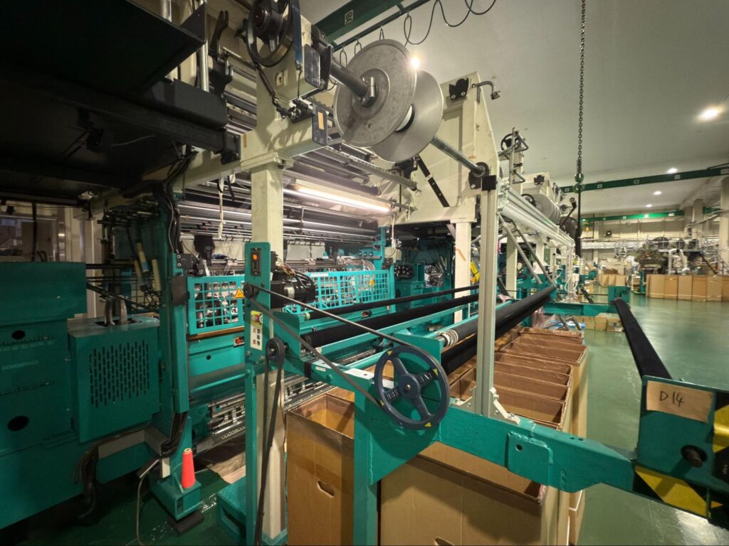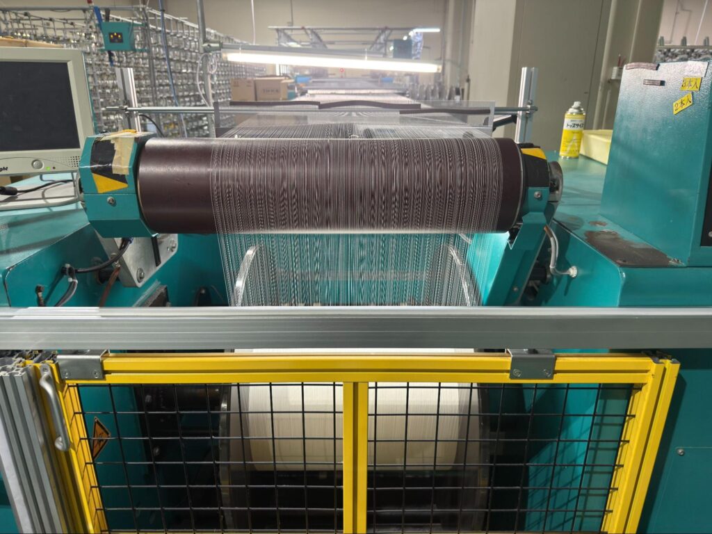 生地を作るための専用の編み機械です。経編機は複数の経糸(たていと)を一定のテンションで張りながら、これらの糸を縦方向に絡み合わせて生地を作ります。経編機の特徴は、高速で大量の生地を編むことができる点と、生地の形状や模様を多様にコントロールできる点にあります。